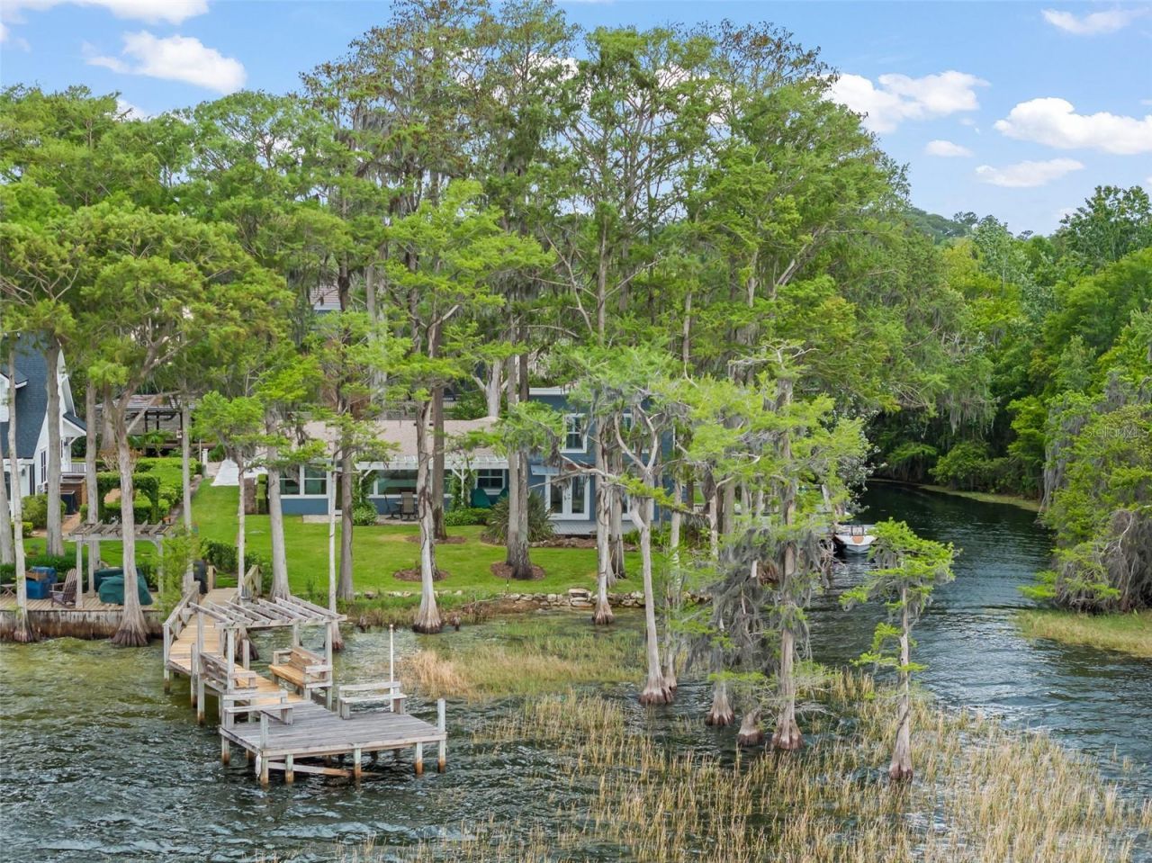 Nestled in the Cypress trees on the northern tip of a secluded Peninsula on Lake Sheen, yet within the gated community of Lake Sheen Reserve, Pineapple Pointe on Lake Cottage Lane exudes character while providing the ultimate private butler chain getaway. Reminiscent of a bygone era where the lakehouse experience meant a quiet sense of peace, Pineapple Pointe offers stunning water views and a natural escape onto the pristine Butler Chain of Lakes like no other. Enjoy the waves lapping against the Cypress adorned sandy shoreline and the long views across stunning Lake Sheen, shimmering in the sun. the quiet canal wraps around the property from the lake, offering a safe harbor from the larger waters, ideal for the boathouse and mooring. Imagine 280 feet of waterfront at the tip of the peninsula! A true cottage, the three bedroom, two-bath home features warm finishes and charm throughout. Off the kitchen, the cozy family room, complete with fireplace, leads to the sunroom, where captivating views of the lake greet. The living room , dressed with wood plank flooring, opens to the large canal side deck amongst the trees. Two additional bedrooms, a bathroom, and a study complete the main floor. The master suite comprises the entire upstairs, with sweeping lake views through the trees, and a large en suite bathroom. A new brick paver driveway/parking area has just been completed-other recent improvements include new roof (2026), 21 new windows (2018), and new AC (2022). Lake Cottage Lane is a private passage that accesses only four homes, and dates to the days of Butler Chain fish camps in the Windermere Groves. Residents of Lake Cottage Lane enjoy the privacy and security of the gated community of Lake Sheen Reserve, without the HOA requirement. This private sanctuary is just minutes from Disney and the many area attractions that Central Florida has to offer, while tucked away as a special paradise on Florida's most famous and sought after chain of lakes.